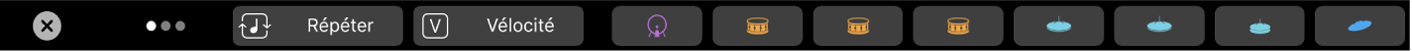 Lorsque vous touchez le bouton Pads de batterie, vous pouvez utiliser la Touch Bar pour jouer des batteries sur une piste Drummer ou d’instrument logiciel à l’aide d’un patch d’ensemble de batterie.