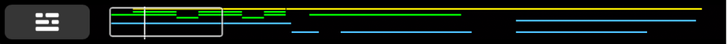 L’écran Vue d’ensemble constitue une représentation de la zone Pistes dans Logic Pro, chaque piste y apparaissant sous forme de ligne fine de couleur. Le rectangle de présentation affiche la zone du morceau visible, où un trait vertical indique la position de la tête de lecture.