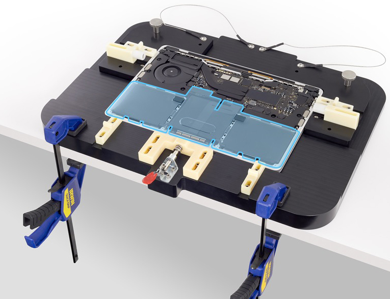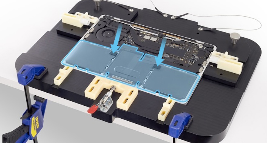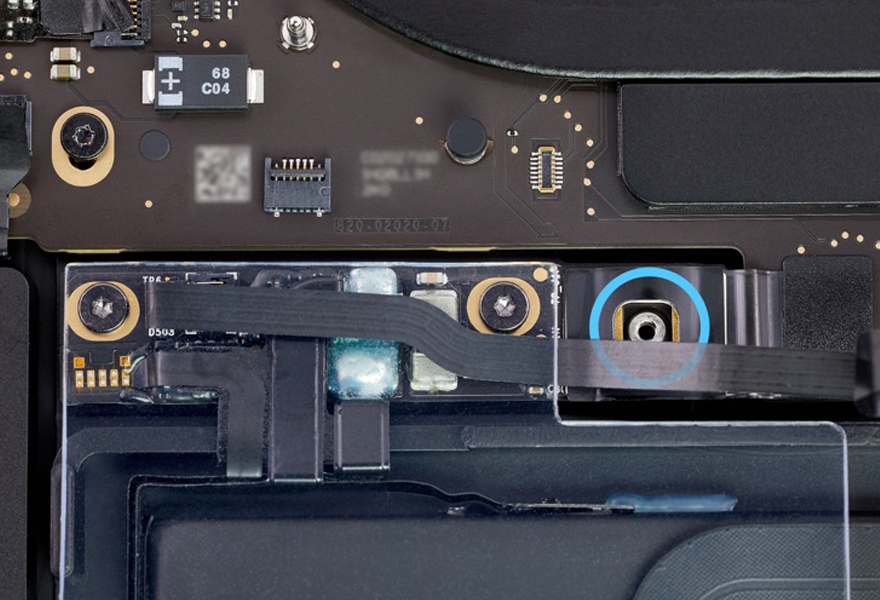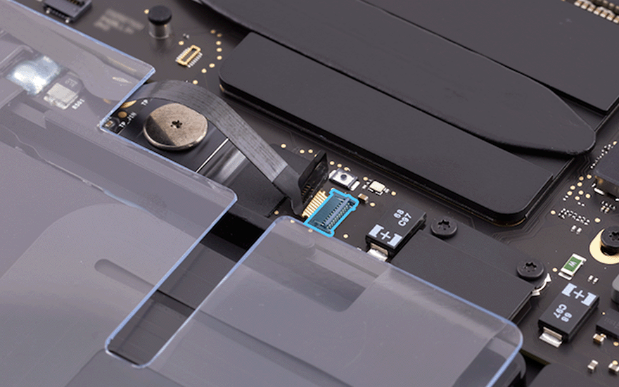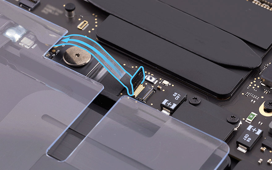 Utilisez les brucelles antistatiques pour écarter délicatement la nappe de connexion de la BMU. À l’aide du tournevis T5, retirez ensuite la vis T5 (923-05241) de la BMU.