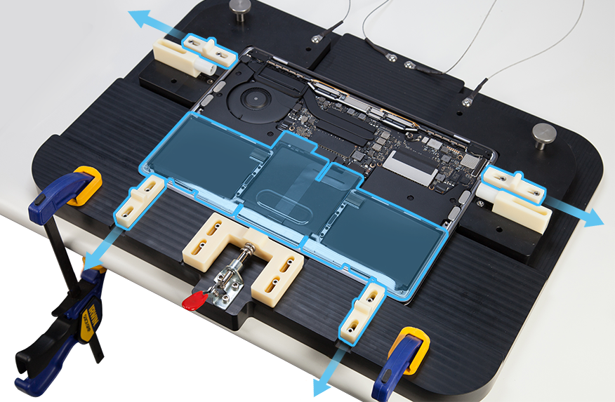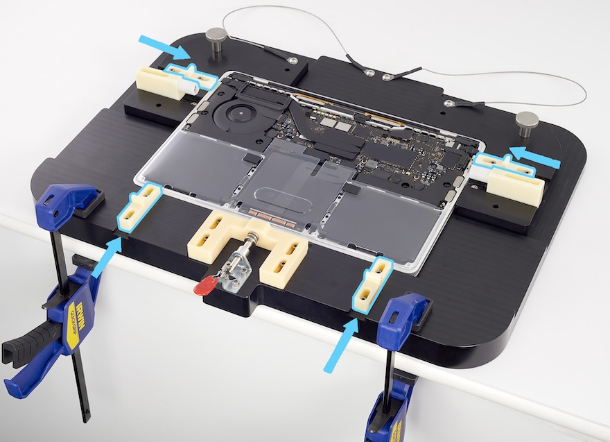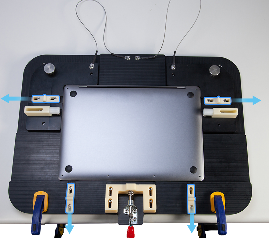 Placez les deux serre-joints en C en bas à gauche et en bas à droite de l’équipement pour boîtier inférieur. Vérifiez que les barres coulissantes des serre-joints en C sont orientées vers le sol. Pressez les poignées pour serrer les serre-joints en C.
