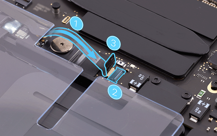 Écartez la nappe de connexion de la BMU. Utilisez ensuite le tournevis T5 pour réinstaller la vis T5 (923-05241) de la BMU.