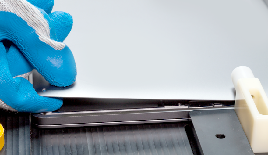 Mettez les gants. À l’aide de la texture de préhension des gants, alignez ensuite délicatement le boîtier inférieur sur la charnière de l’écran et le boîtier supérieur.
