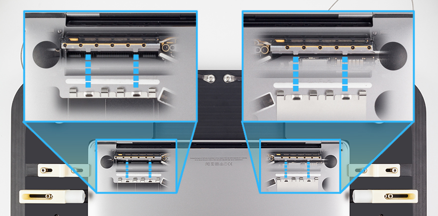 Placez l’ordinateur dans l’équipement pour boîtier inférieur, le boîtier inférieur tourné vers le haut et la charnière de l’écran dans la direction opposée à la vôtre.
