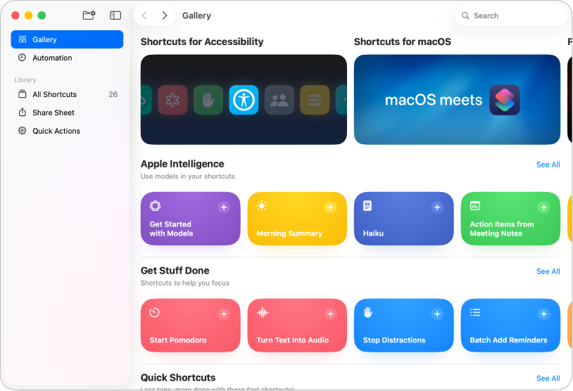 Galerija sadrži pohranjenu kolekciju kreativnih i korisnih prečaca. Istražite Galeriju i provjerite mogućnosti prečaca te vidite kako se izrađuju. Kad pronađete prečac Galerije koji vam se sviđa, dodajte ga kolekciji prečaca i prilagodite ga svojim potrebama.