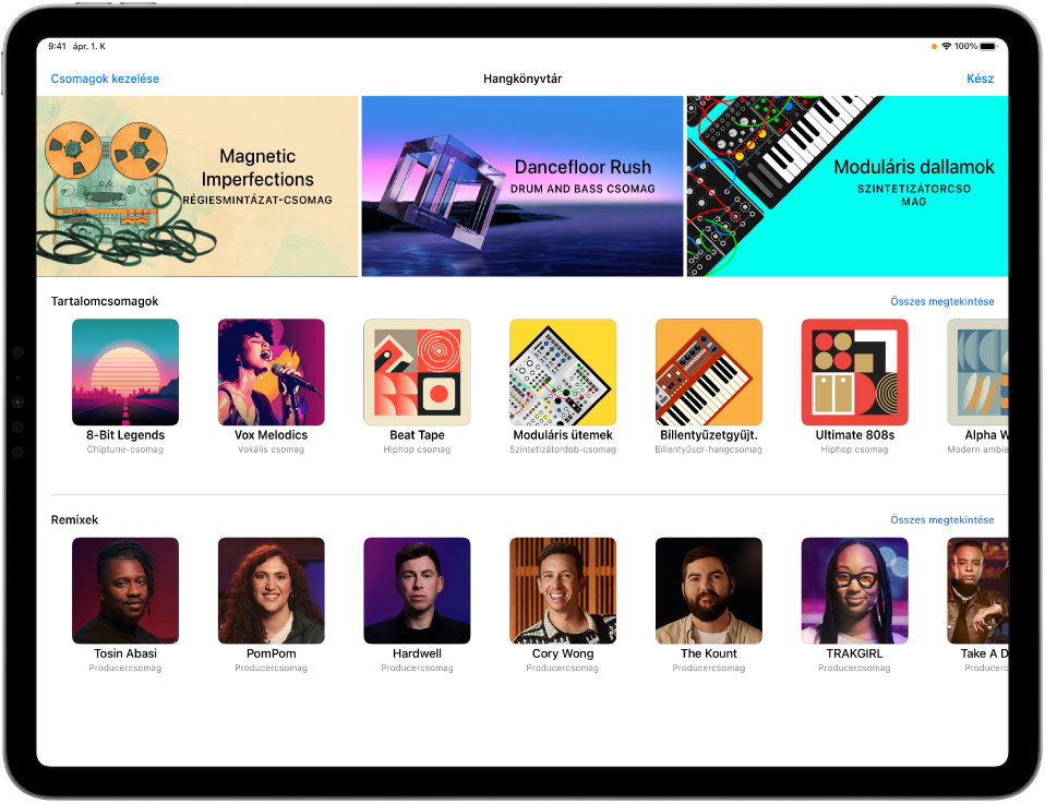A Hangkönyvtárral több száz loopot, hangot, érintőhangszert, dobkészletet és másokat tartalmazó hangcsomagokat tölthet le és kezelhet. A GarageBand tájékoztatja, amikor új hangcsomagok tölthetők le.