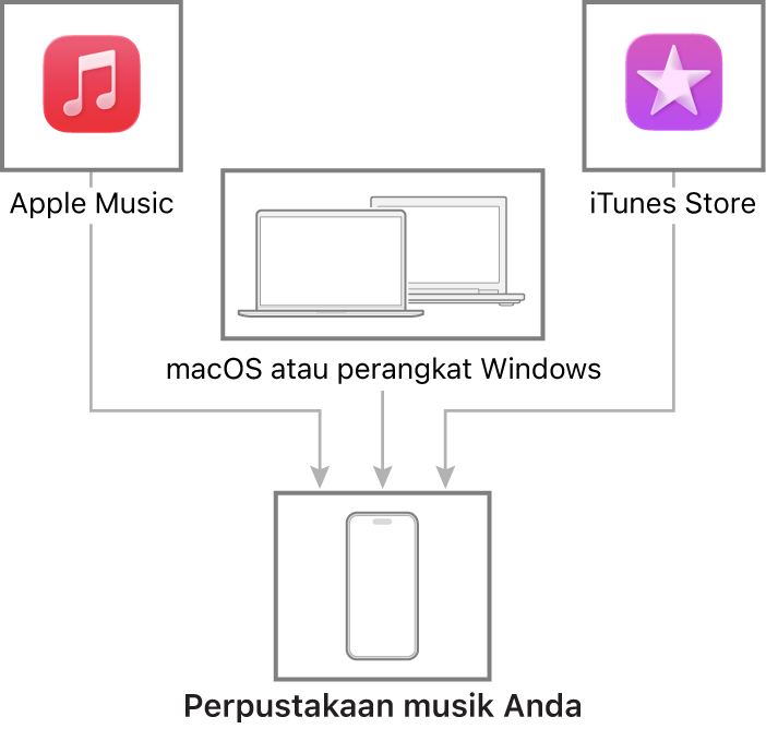 Hubungkan Mac atau perangkat Windows Anda untuk mentransfer dan memperbarui musik antara iPhone dan perangkat Anda. Untuk menyelaraskan konten yang didukung, gunakan Musik (macOS 10.15 atau lebih baru) atau iTunes (macOS 10.14 atau lebih lama dan perangkat Windows).