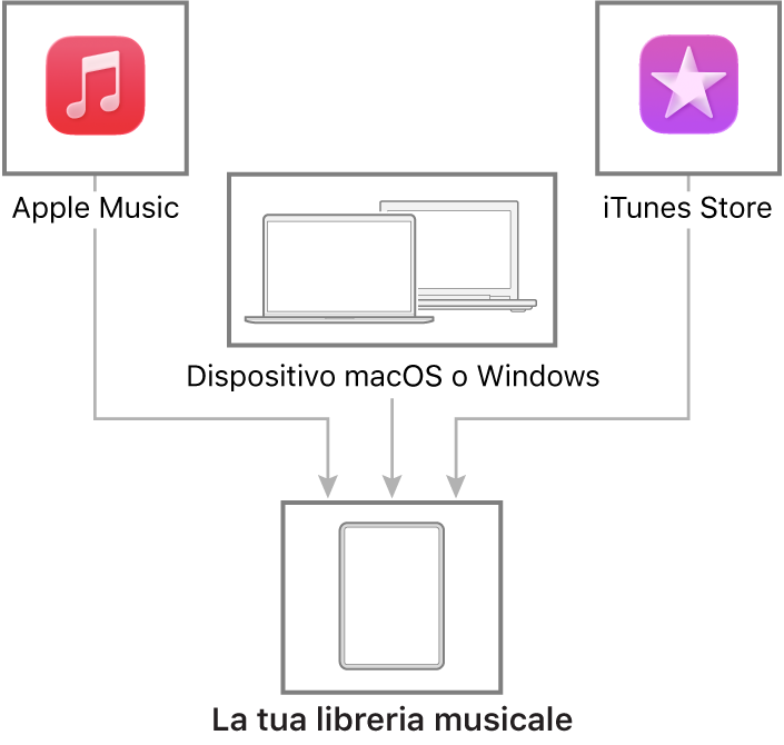 Collega un Mac o un dispositivo Windows per trasferire e aggiornare la musica su iPad. Per sincronizzare i contenuti supportati, usa Musica (macOS 10.15 o versione successiva) o iTunes (macOS 10.14 o versioni precedenti e dispositivi Windows).