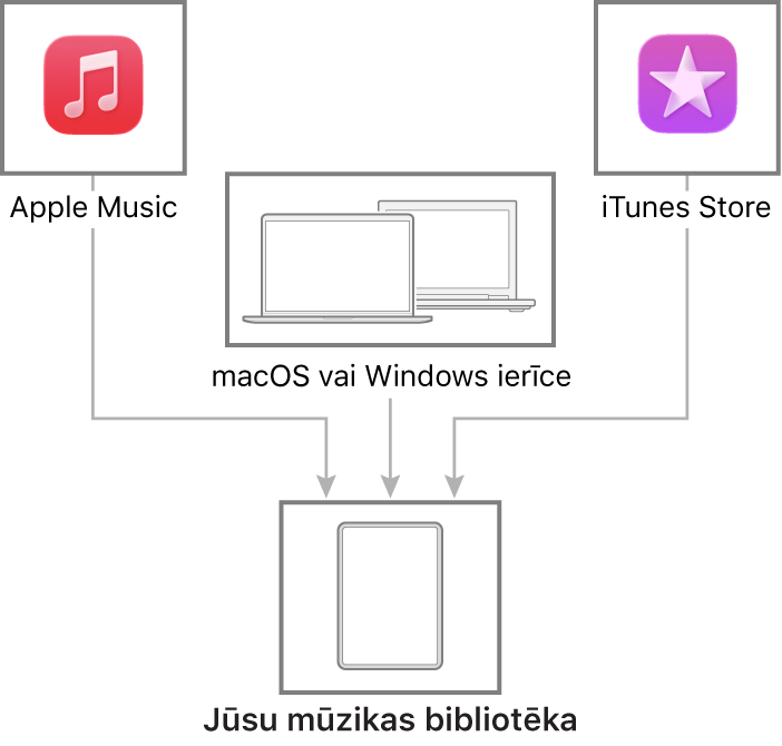Pievienojiet savu Mac vai Windows ierīci, lai pārsūtītu un atjauninātu mūziku starp savu iPad un ierīci. Lai sinhronizētu atbalstīto saturu, izmantojiet lietotni Music (macOS 10.15 vai jaunākās sistēmās) vai iTunes (macOS 10.14 un vecākās sistēmās un Windows ierīcēs).