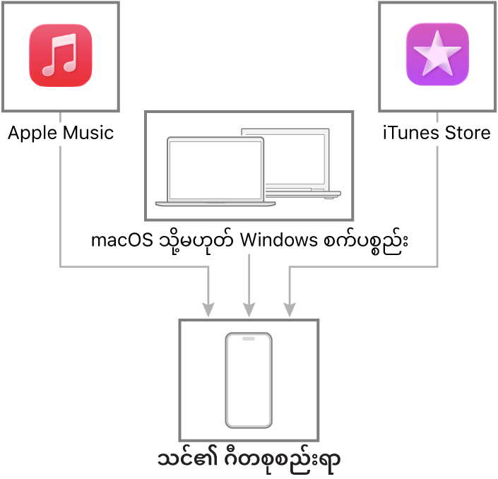 သင့် iPhone နှင့် သင့်စက်ပစ္စည်းကြားတွင် သီချင်းများလွှဲပြောင်းရန်နှင့် အချိန်နှင့်တစ်ပြေးညီထားရန် သင့် Mac သို့မဟုတ် Windows စက်ပစ္စည်းကိုချိတ်ဆက်ပါ။ အထောက်အကူပြုထားသော အကြောင်းအရာကို တစ်ပြိုင်နက်ချိန်ကိုက်ခြင်းပြုလုပ်ရန် Music (macOS 10.15 သို့မဟုတ် နောက်ပိုင်းအမျိုးအစားများ) သို့မဟုတ် iTunes (macOS 10.14 သို့မဟုတ် အစောပိုင်းထွက်များနှင့် Windows စက်ပစ္စည်းများ) ကိုအသုံးပြုပါ။