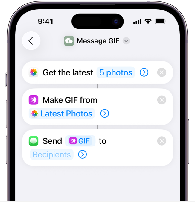 A Galeria oferece uma coleção seleta de atalhos criativos e úteis. Explore a Galeria para conferir as possibilidades de atalhos e ver como eles são feitos. Quando encontrar um atalho da Galeria de que você goste, toque-o para adicioná-lo à coleção de atalhos e personalize-o conforme as suas necessidades.