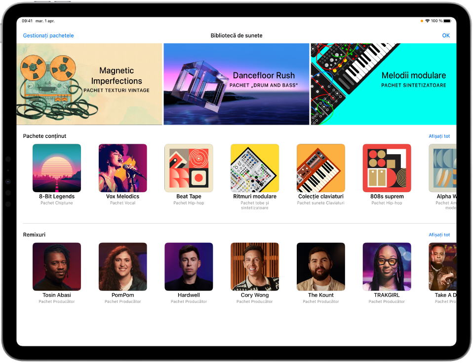Utilizați biblioteca de sunete pentru a descărca și gestiona pachete de sunete care conțin sute de bucle, sunete, instrumente tactile, seturi de tobe și altele. GarageBand vă anunță când sunt disponibile pentru descărcare noi pachete de sunete.