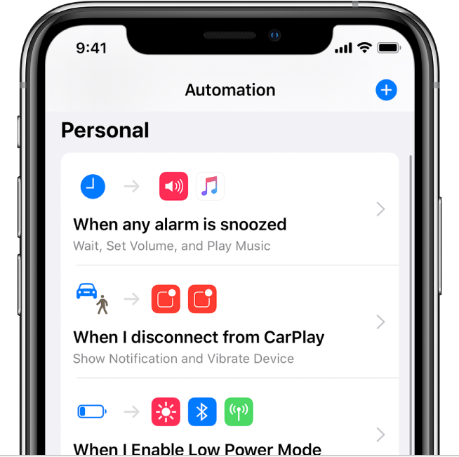 Automatizarea este un tip de scurtătură declanșată de un eveniment, și nu manual. Puteți utiliza aplicația Scurtături pentru a configura o automatizare personală sau pentru locuință, iar apoi scurtătura automatizată poate fi declanșată de sosirea sau plecarea dvs., de o configurare a iPhone-ului, de un moment al zilei etc.