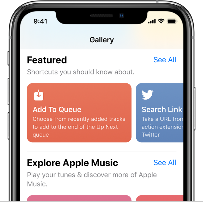 Galeria prezintă o colecție de scurtături creative și utile, atent selecționate. Explorați secțiunea Galerie pentru a studia posibilitățile în privința scurtăturilor și pentru a afla cum sunt construite. Atunci când găsiți în Galerie o scurtătură care vă place, adăugați‑o în colecția Scurtăturile dvs. printr‑o simplă apăsare și personalizați‑o în funcție de nevoile dvs.
