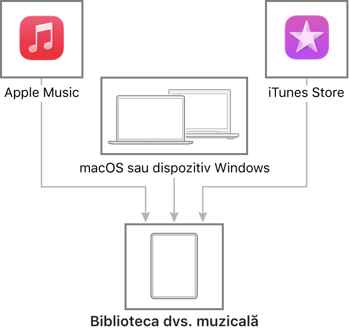 Conectați Mac-ul sau dispozitivul Windows pentru a transfera și actualiza muzica între iPad și dispozitivul dvs. Pentru a sincroniza conținut compatibil, utilizați aplicația Muzică (macOS 10.15 sau versiuni ulterioare) sau iTunes (macOS 10.14 sau versiuni anterioare și dispozitive Windows).
