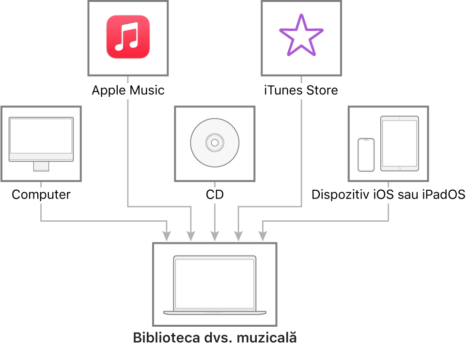 Odată ce începeți să utilizați aplicația Muzică pe Mac, vă puteți construi biblioteca muzicală (colecția dvs. de melodii și albume) în numeroase moduri.