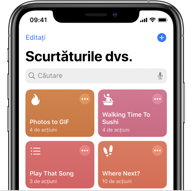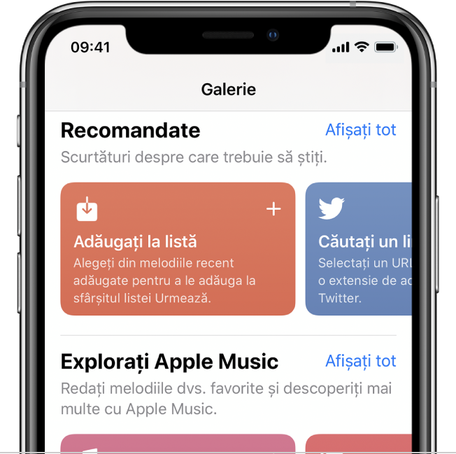 Galeria prezintă o colecție de scurtături creative și utile, atent selecționate. Explorați secțiunea Galerie pentru a studia posibilitățile în privința scurtăturilor și pentru a afla cum sunt construite. Atunci când găsiți în Galerie o scurtătură care vă place, adăugați‑o în colecția Scurtăturile dvs. printr‑o simplă apăsare și personalizați‑o în funcție de nevoile dvs.