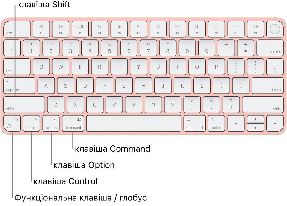 Примітка. Якщо у вас є Apple Magic Keyboard з Touch ID і цифровою клавіатурою, функціональна клавіша (Fn)/клавіша глобуса розташована справа від клавіші Delete.
