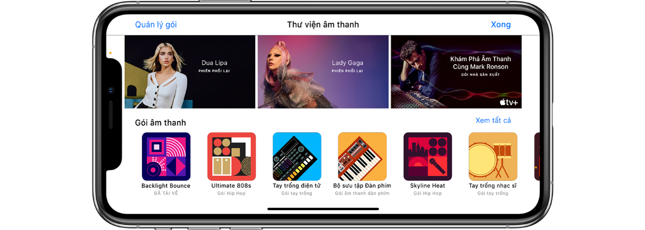 Sử dụng Thư viện âm thanh để tải về và quản lý các gói âm thanh chứa hàng trăm vòng lặp, âm thanh, nhạc cụ cảm ứng, bộ trống, v.v. GarageBand thông báo cho bạn khi có sẵn các gói âm thanh mới để tải về.