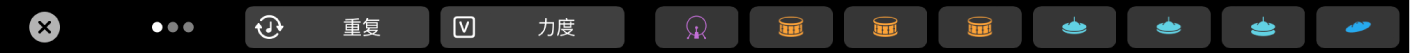 轻点“鼓垫”按钮时,可以使用触控栏在具有架子鼓 Patch 的鼓手或软件乐器轨道上弹奏鼓。