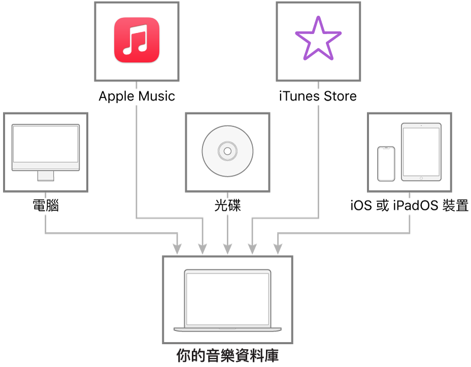 如果你的電腦中有 CD 或 DVD 光碟機,或你有外置光碟機,你可以將音樂從光碟輸入你的音樂資料庫。 然後,你即使沒有光碟也可以隨時播放那些音樂。