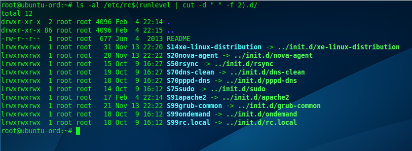 startup processes:ls -al /etc/rc$(runlevel | cut -d " " -f 2).d/The output is similar to the following image: