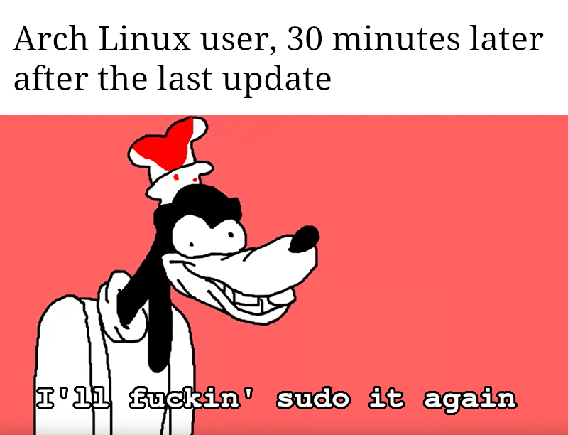sudo pacman -Syuas a ritual each time when I start my computer or laptop. Like, the very first thing after the system is booted. So far so good, been doing that for 7 years.alias p=“sudo pacman -Syu”