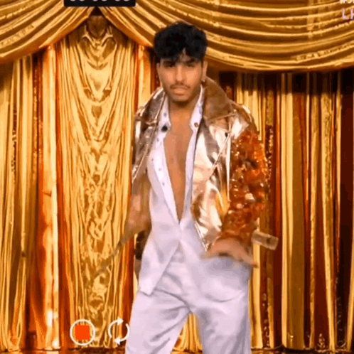 Описание контента: a man in a gold jacket is dancing in front of a gold curtain ..