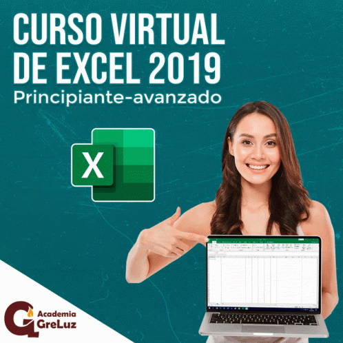 Mô tả nội dung: a woman is holding a laptop and pointing at it with the words curso virtual de excel 2019 in the background