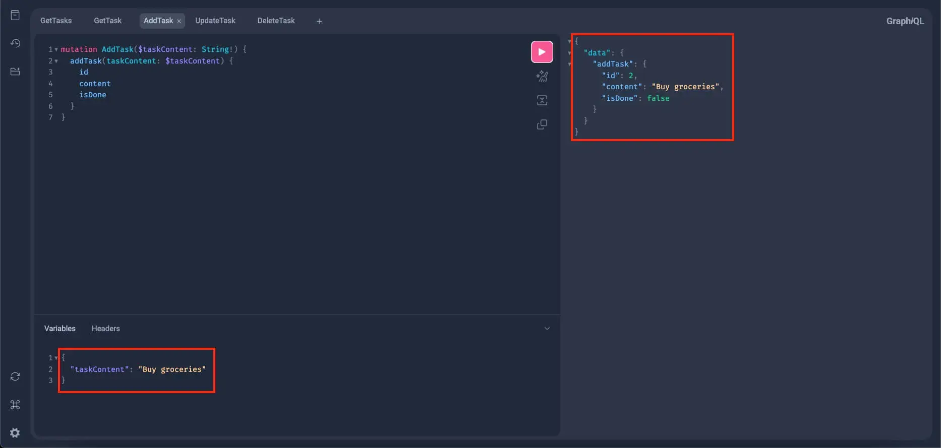 If the server responds with a task object, it means the new task was added to the database and the add_task mutation resolver seems to be working properly.