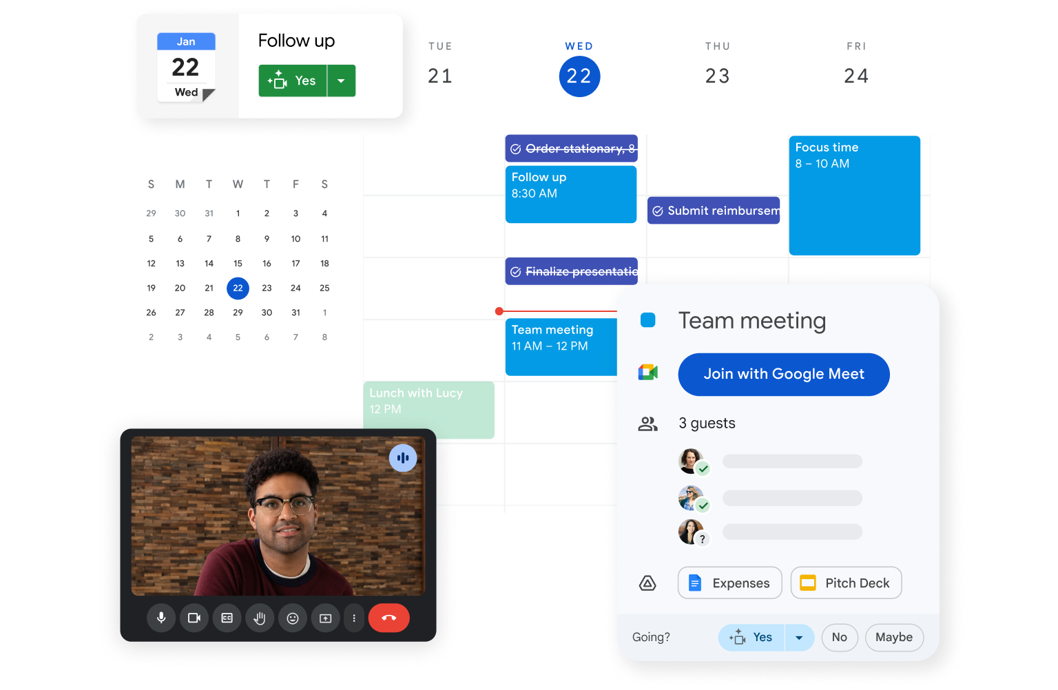 يمكنك تقليل الوقت الذي تقضيه في التخطيط واستثماره في العمل من خلال الاستفادة من تقويم يمكن مشاركته ويعمل في جميع تطبيقات Google Workspace.