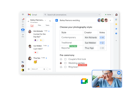 Start a Chat, jump into a video call with Meet, or collaborate in a Doc, all right from Gmail.