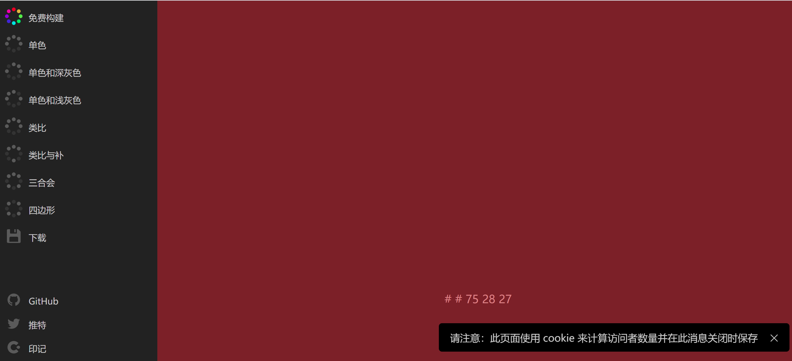 Colourco 是一个在线配色的工具。通过控制鼠标在屏幕上的移动来选定颜色,适合喜欢随心搭配的你。它可以选定颜色组合,鼠标移动同时控制一组色彩的变化。点击一下就能锁定,也可以进一步调整参数。