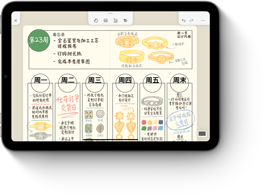 Apple Pencil Pro 可感应到轻捏手势并弹出工具盘,以便你快速切换工具、线条粗细度和颜色。