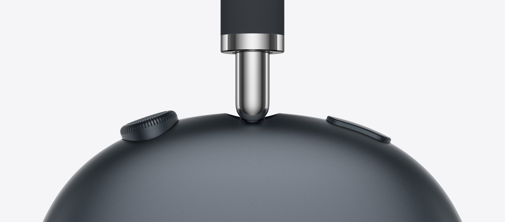 AirPods Max 2 Kopfhörer in Violett, Detailansicht von oben auf Taste für Geräuschkontrolle und Transparenzmodus