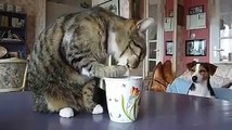 Ce chat boit dans sa tasse et nargue le pauvre chien qui le regarde