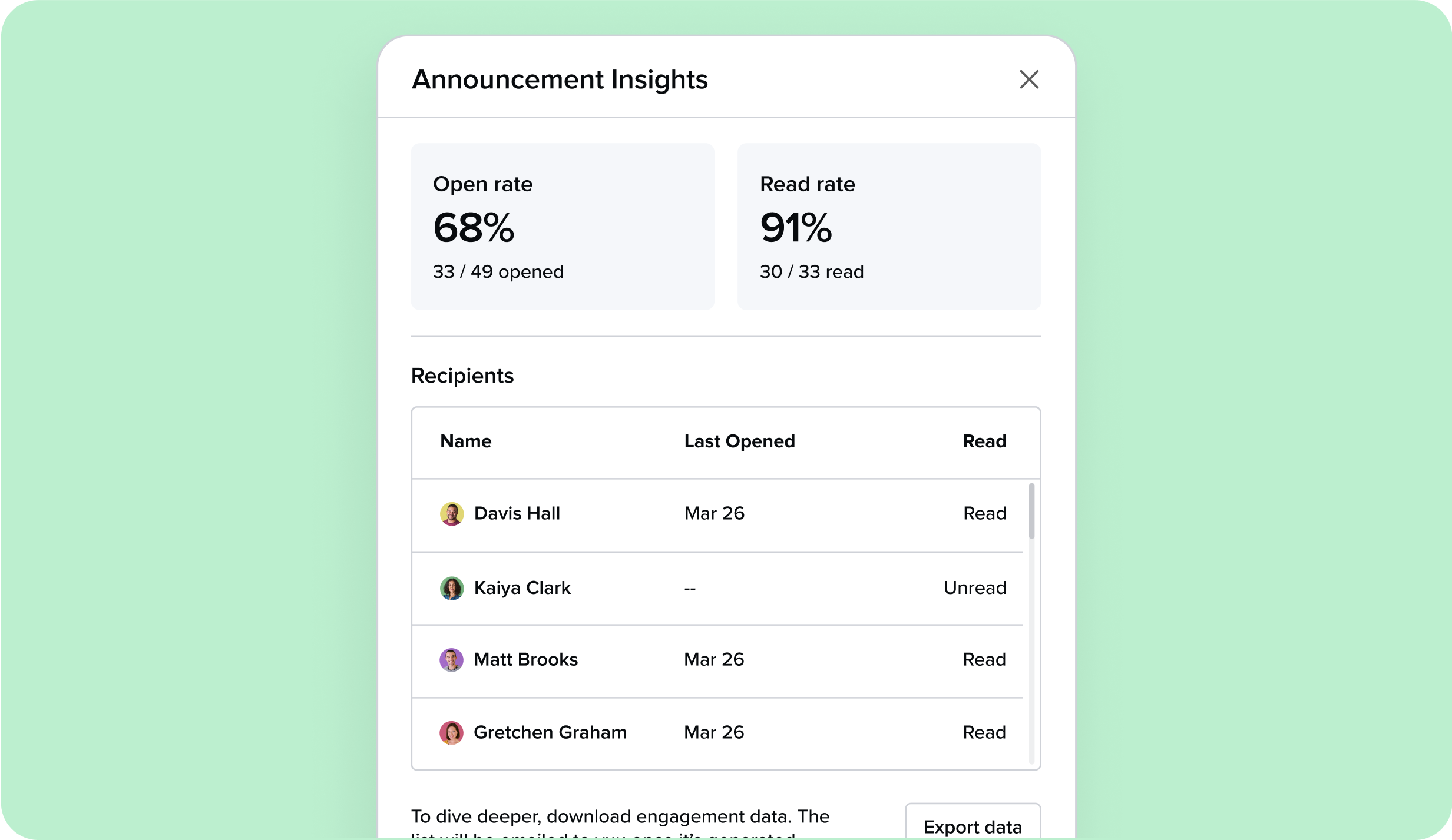 Engagement analytics show who’s viewed an announcement and when, giving you real insight into the reach and clarity of your message.