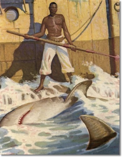 "Buoyed up by that coffin, for almost one whole day and night, I floated on a soft and dirgelike main. The unharming sharks, they glided by as if with padlocks on their mouths; the savage sea-hawks sailed with sheathed beaks. On the second day, a sail drew near, nearer, and picked me up at last. It was the devious-cruising Rachel, that in her retracing search after her missing children, only found another orphan."