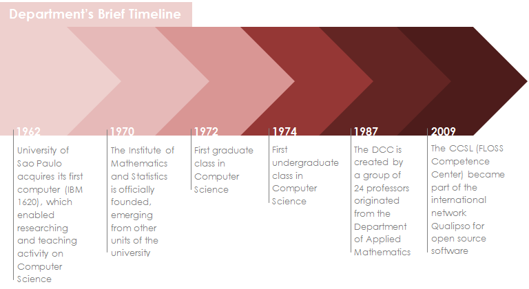 The Department of Computer Science (DCC) was formally set up in 1987, although the Institute has been developing works related to Computation since 1970. The DCC is responsible for graduate, undergraduate, and extension courses in Computer Science, besides offering introductory courses to Computation to other courses of the University.