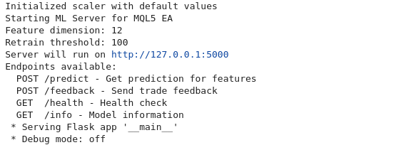 @app.route('/health', methods=['GET']) def health_check(): """Health check endpoint for monitoring""" return jsonify({ "status": "healthy", "timestamp": datetime.utcnow().isoformat(), "buffer_size": len(feedback_buffer), "feature_dim": FEATURE_DIM }) # optional endpoint to force retrain (admin) @app.route('/retrain', methods=['POST']) def retrain_now(): threading.Thread(target=retrain_model).start() return jsonify({"status": "retrain_started", "buffer_size": len(feedback_buffer)}) @app.route('/info', methods=['GET']) def info(): """Get information about the current model state""" return jsonify({ "feature_dim": FEATURE_DIM, "feedback_buffer_size": len(feedback_buffer), "retrain_threshold": RETRAIN_THRESHOLD, "model_path": MODEL_PATH, "scaler_fitted": hasattr(scaler, 'mean_') and scaler.mean_ is not None }) if __name__ == "__main__": print(f"Starting ML Server for MQL5 EA") print(f"Feature dimension: {FEATURE_DIM}") print(f"Retrain threshold: {RETRAIN_THRESHOLD}") print(f"Server will run on http://127.0.0.1:5000") print(f"Endpoints available:") print(f" POST /predict - Get prediction for features") print(f" POST /feedback - Send trade feedback") print(f" GET /health - Health check") print(f" GET /info - Model information") # Start the server app.run(host="127.0.0.1", port=5000, debug=False, threaded=True)Zum Abschluss der Implementierung fügen wir drei Dienstprogramm-Endpunkte hinzu: /health, /retrain und /info, die die Überwachung, Steuerung und den Einblick in den Betriebszustand des Modells ermöglichen. Der /health-Endpunkt dient als schnelles Diagnosewerkzeug, das den aktuellen Status des Systems, den Zeitstempel und die Puffergröße meldet, um einen reibungslosen Betrieb zu gewährleisten. Mit dem Endpunkt /retrain können Administratoren bei Bedarf manuell eine Modellumschulung auslösen, die asynchron ausgeführt wird, um den Hauptprozess des Servers nicht zu unterbrechen. Schließlich liefert der Endpunkt /info detaillierte Metadaten über das Modell, einschließlich der Merkmalsdimensionen, des Retrain-Schwellenwerts und des Skalierungsstatus, und bietet so Transparenz über den Lernstatus des Systems.