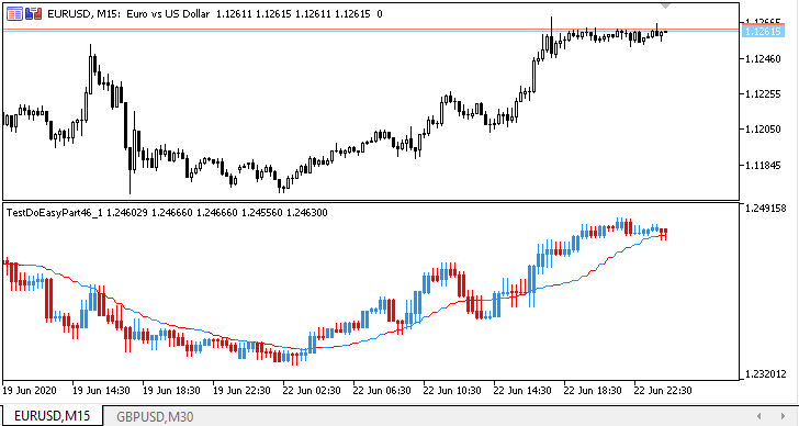 To perform the test, let's take the indicator from the previous article and save it in \MQL5\Indicators\TestDoEasy\Part46\ as TestDoEasyPart46_1.mq5.