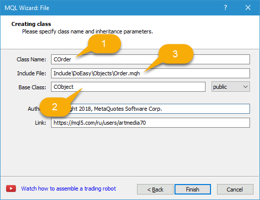 これで、最初のクラス(抽象注文クラス)を作成できます。Objectsフォルダに新しいクラスを作成して、COrder (1)と名付けます。標準ライブラリのCObject (2)クラスを必ず基本クラスに設定してください。この場合、新しいオブジェクトクラスはCObjectクラスから継承され、それを標準ライブラリのCArrayObjオブジェクトのリストに入れることができます。