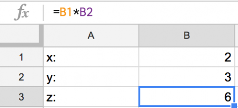 The spreadsheet assigns cell B1 with a value of 2, cell B2 with a value of 3 and a third cell, B3, with an expression that multiplies the value of B1 by the value of B2. When the value of either of the components referenced in the expression changes, the change is observed and the expression is re-evaluated automagically in B3: