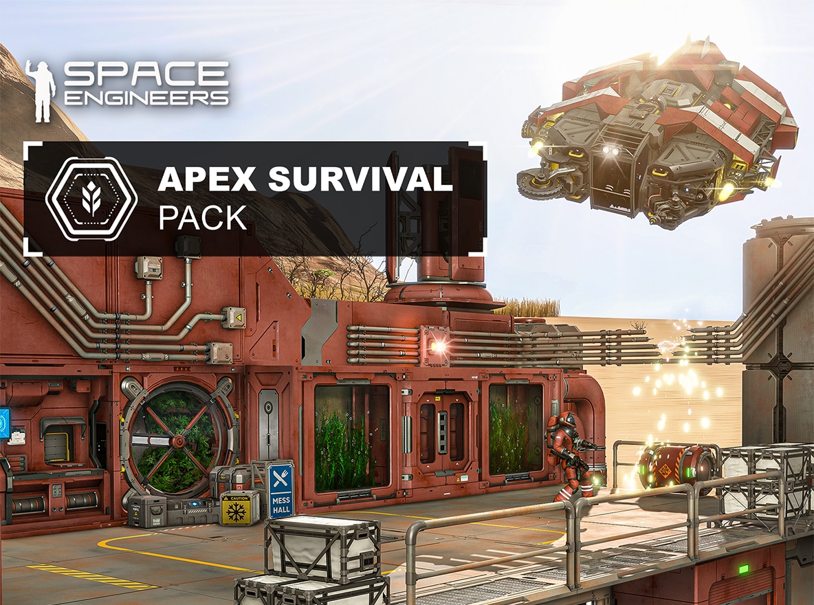 Space Engineers: Apex Survival Pack includes Welder Type II, Grinder Type II, Drill Type II, Half Oxygen Farm, Half Algae Farm, Inset Terrarium Desert, Inset Terrarium Forest, Inset Planter, Survival Kit Type II, Ore Detector Type II, Storage Bin Set, Conduit Set, Warning Signs