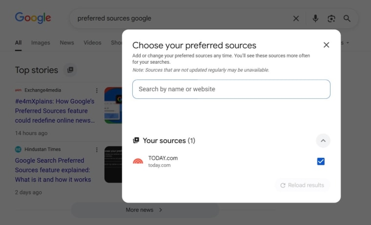 To add Shop TODAY as a preferred source, simply open up your Google Search results page directly on your computer or phone. Type in a specific phrase or topic in the search bar, hit enter and keep scrolling until you see the Top Stories module appear. Once there, you’ll notice a circle with a starred folder icon inside to the right of Top Stories. Add "TODAY.com" in the required field and check the blue box. Refresh your results and TODAY.com, along with Shop TODAY (which is part of TODAY.com), will automatically be saved as one of your preferred sources.