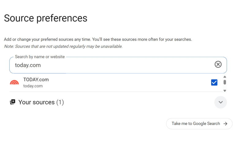 Another way to add us as a preferred source is to click here and type in “TODAY.com.” Once the box is checked and you've refreshed the page, Shop TODAY content will start appearing in your feed. Get ready for lots of award-winning mature skin care, beauty and travel content to flood your feed. The best part? There is no cap, so you can select as many sources as your heart desires!