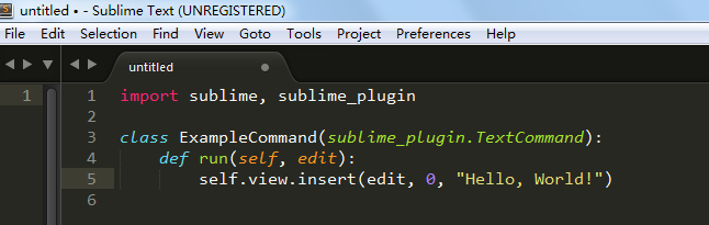 2. 通过Preferences -> Browse Packages…打开Packages文件夹,在该文件夹下建立个子文件夹,名字为你想开发的插件名字,如:defineReplace。 回到插件开发的初始化编辑器页面,通过 ctrl+s 保存这个文件,并放到你建立的子文件夹下,文件名如:defineReplace.py 。 3、通过 ctrl+` 快捷键或者View -> Show Console 打开SublimeText的控制台。 并在输入框执行如下的命令:view.run_command(‘example’) 执行结果如下,第一行插入了Hello,World!: 4、ExampleCommand类名字改为你想要的插件名字,如: definereplaceCommand(将Command之前的名称先全部小写,当然还有其他方式),然后就可以开发该插件对应的功能了,当然这时候输入的命令也变成了view.run_command(‘definereplace’),这样执行才有效。